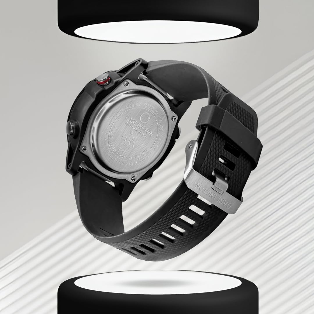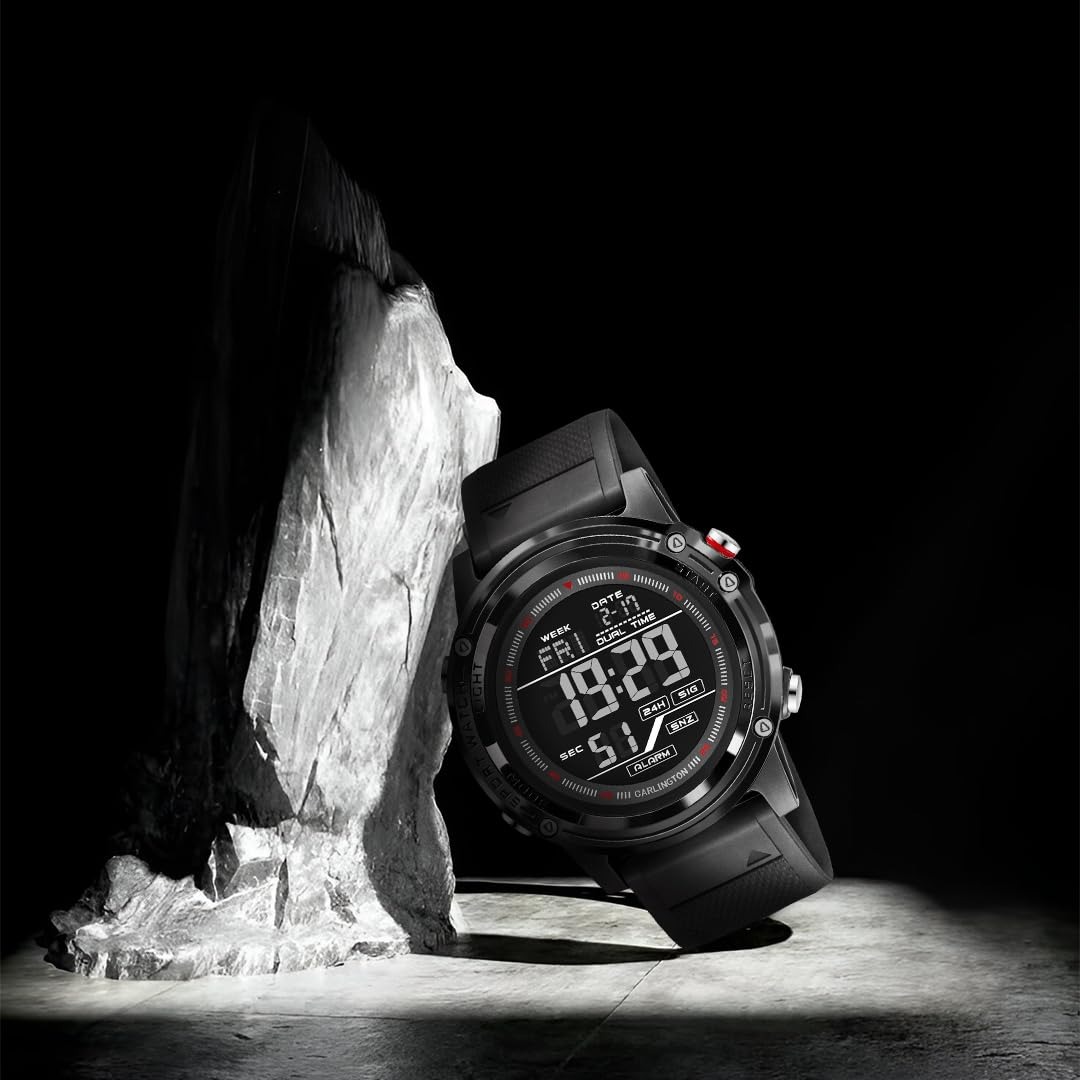 ساعة رياضية تجمع بين العرض التناظري والرقمي بتصميم عصري قوي مناسب للاستخدام اليومي والأنشطة الخارجية.