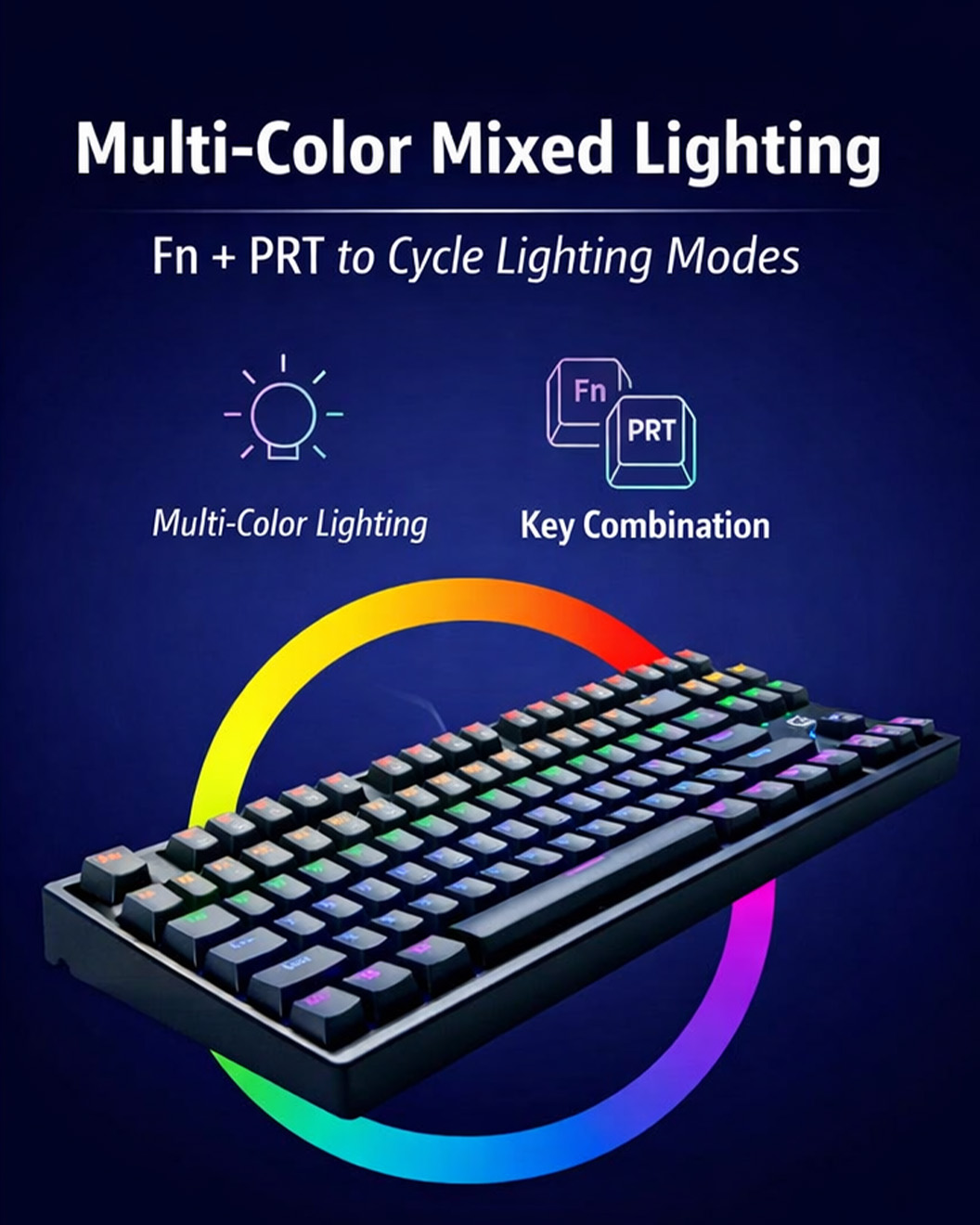 كيبورد ميكانيكي متطوّر مصمّم خصيصًا لعشّاق الألعاب والأداء العالي. يتميّز بتصميم عصري وقوي مع هيكل متين يتحمّل الاستخدام المكثّف. إضاءة RGB متعددة الألوان تمنحك مظهرًا جذّابًا ويمكنها تحسين تجربة اللعب خصوصًا في الإضاءة الخافتة.