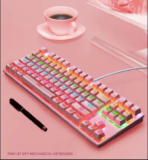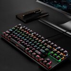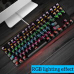 لوحة مفاتيح ميكانيكية للألعاب تتميز بمفاتيح زرقاء توفر استجابة سريعة وصوت نقر مميز. تضم 87 مفتاحًا مع إضاءة خلفية RGB قابلة للتخصيص بـ9 أوضاع مختلفة، مما يضفي جمالية على تجربة اللعب. تصميم سلكي يضمن اتصالًا مستقرًا، وهي مثالية للاعبين الذين يبحثون عن أداء موثوق.